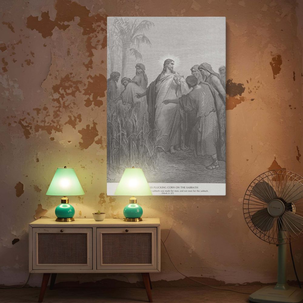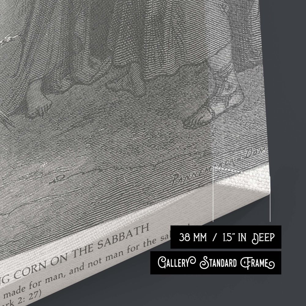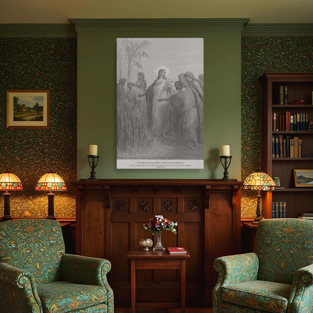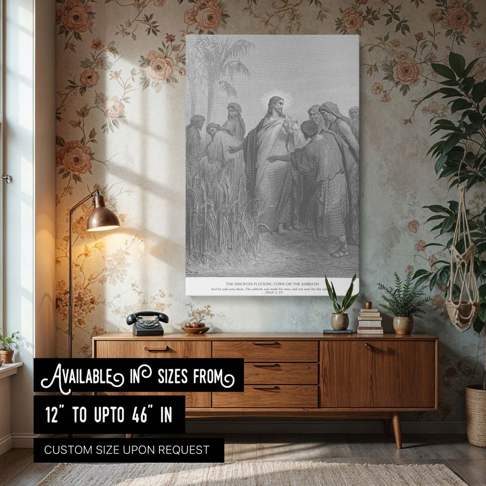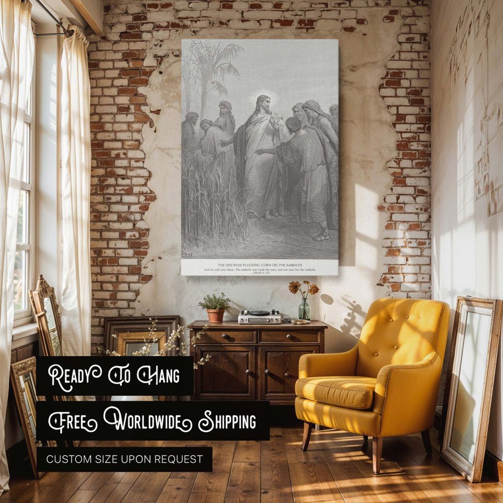 Bring timeless biblical teaching into your space with this powerful canvas wall art reproduction of The Disciples Pluck Grain on the Sabbath by Gustave Dore. Based on Mark 2:27, this engraving captures a moment of deep spiritual clarity, where Jesus defends his disciples after they are criticized for plucking grain on the Sabbath.