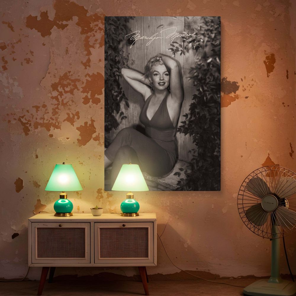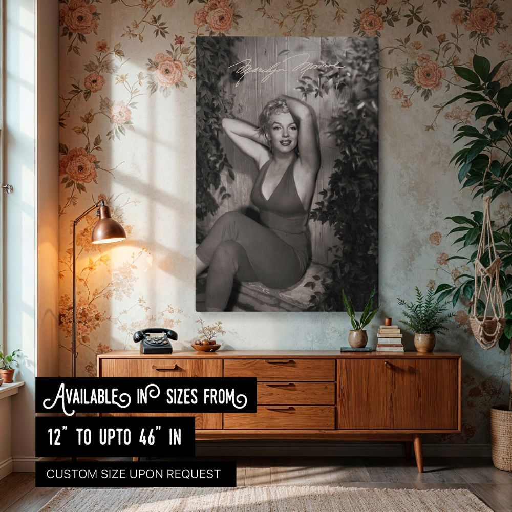 Celebrate the timeless beauty and effortless charm of Marilyn Monroe with this striking black and white photograph. Captured in a relaxed pose, Marilyn is seen leaning gracefully against a rustic wooden backdrop surrounded by lush foliage. Dressed in her iconic red halter jumpsuit-rendered here in monochrome-she exudes poise, femininity, and star power, reminding us why she remains a symbol of glamour decades later.
