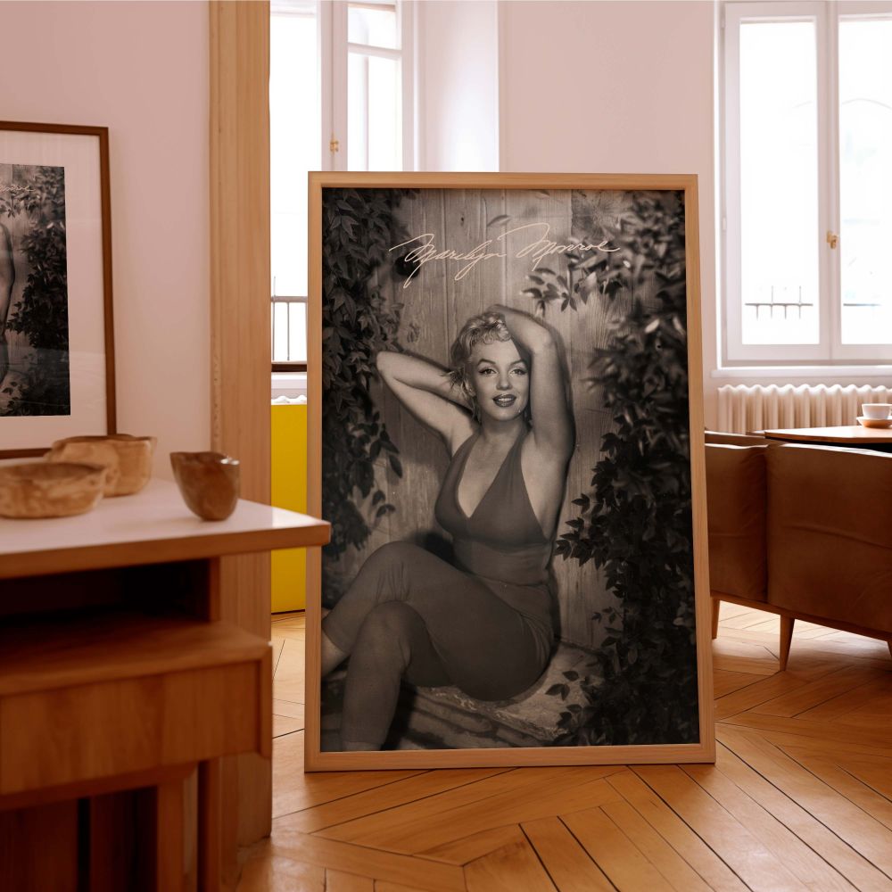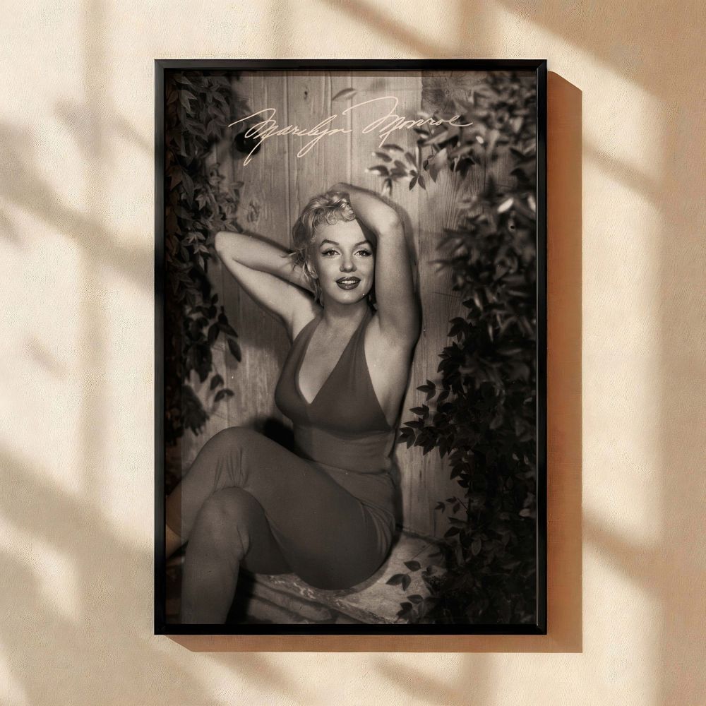 This image perfectly captures Marilyn Monroe's unique blend of sensuality and sophistication. Her soft smile and confident pose tell a story of a woman who defined an era and continues to influence fashion, photography, and film to this day. Whether you're a lifelong fan of vintage Hollywood or simply appreciate classic aesthetics, this photograph makes an unforgettable statement in any space.