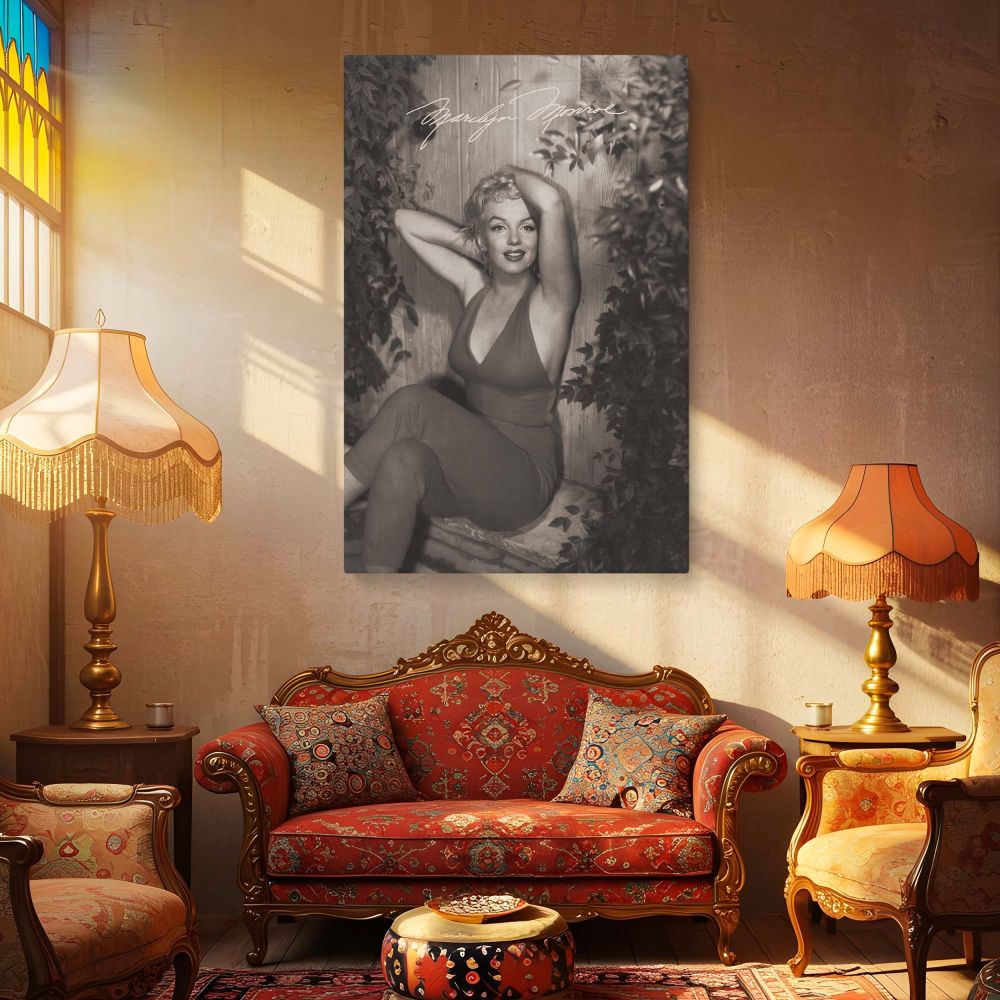 Offered as a premium canvas or photographic print, this artwork is produced with exceptional clarity and detail. The contrast of shadows and highlights enhances the emotional depth of the image, drawing the viewer in to admire the grace and confidence Marilyn so effortlessly projected. It's a must-have for collectors of celebrity portraits, fashion photography, or golden-age film memorabilia.