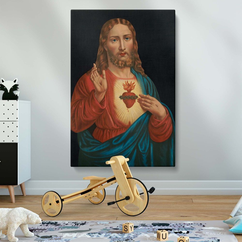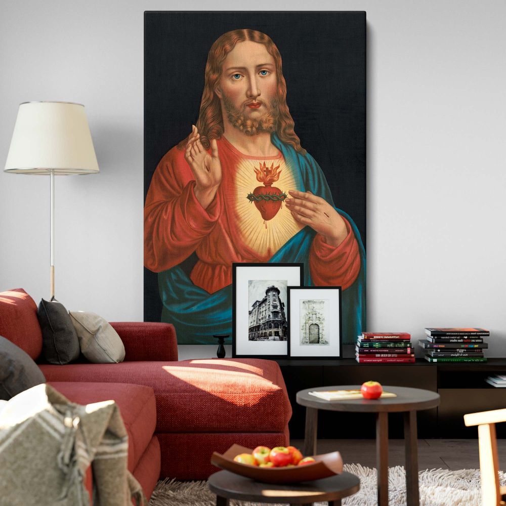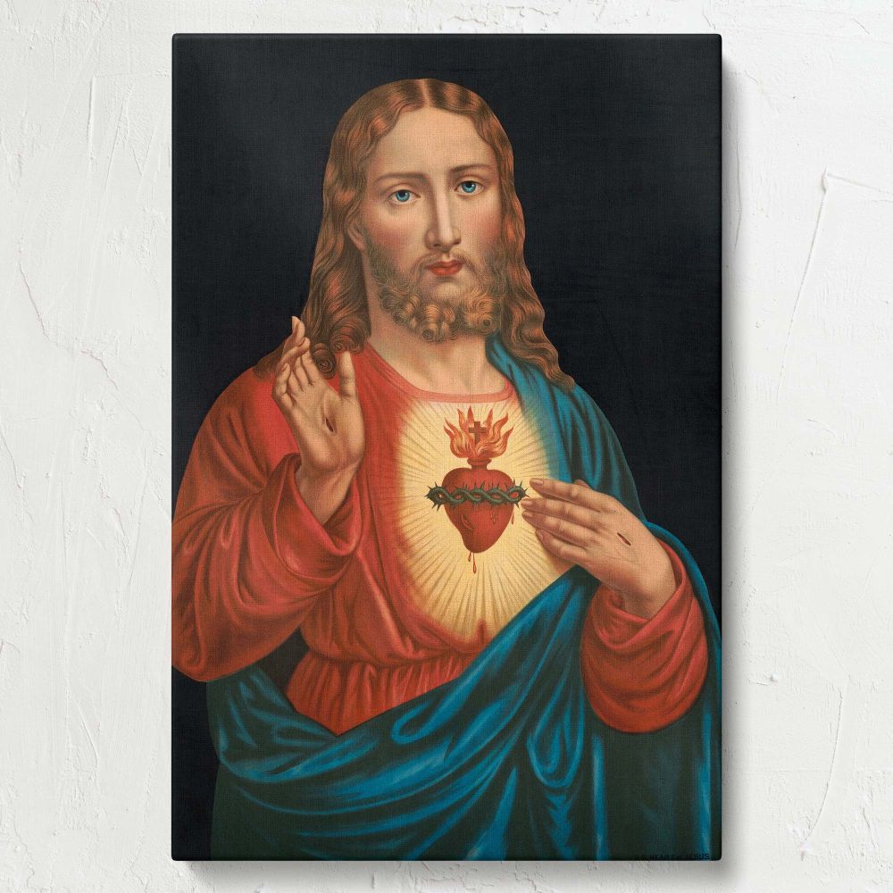 Sacred Heart of Jesus classic Catholic artwork with glowing heart & blessing hand in vivid colors turned into a devotional canvas wall print
